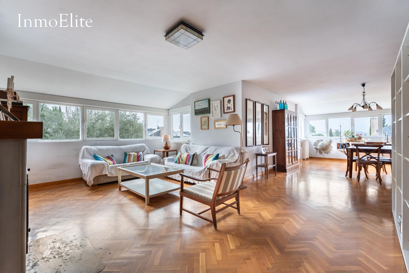 Dispone de un gran salón-comedor con chimenea que aporta calidez y unas estupendas vistas a la Sierrad de Madrid, así como cocina amueblada con office, facilitando la convivencia diaria sin perder funcionalidad.