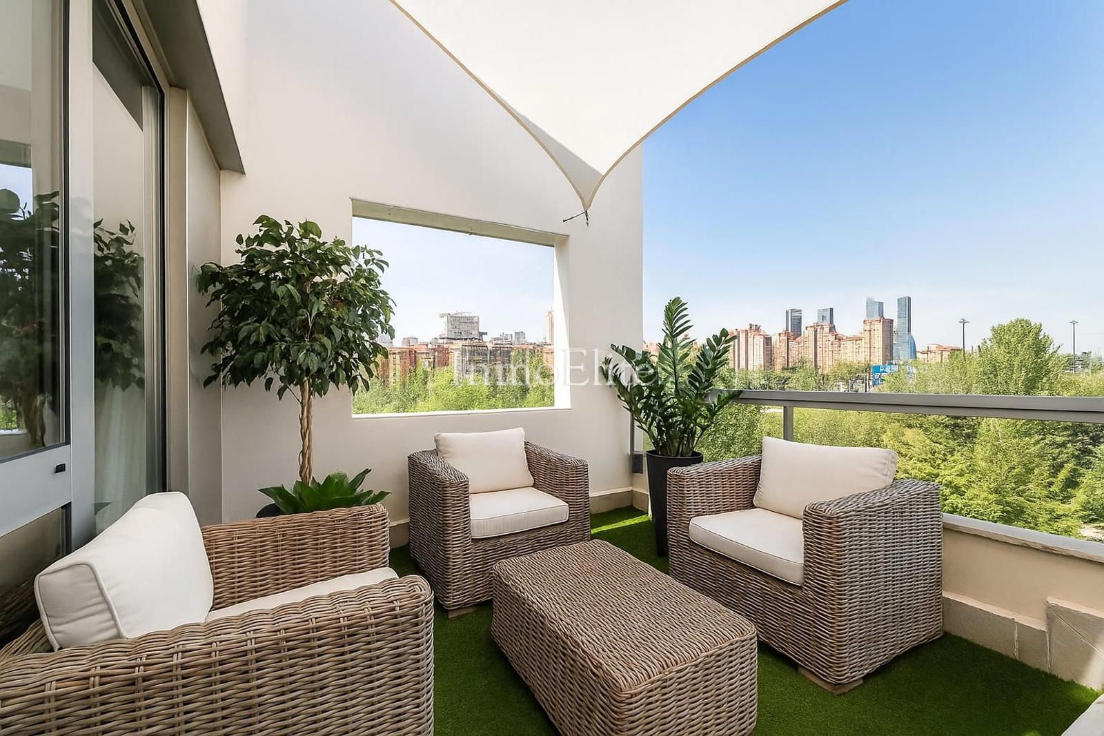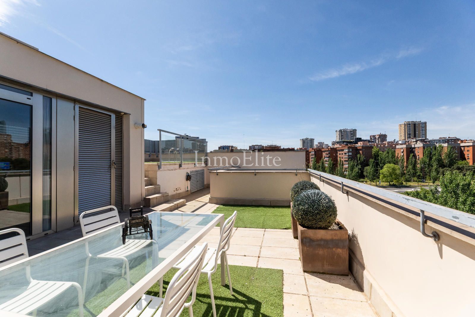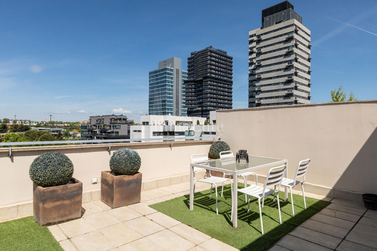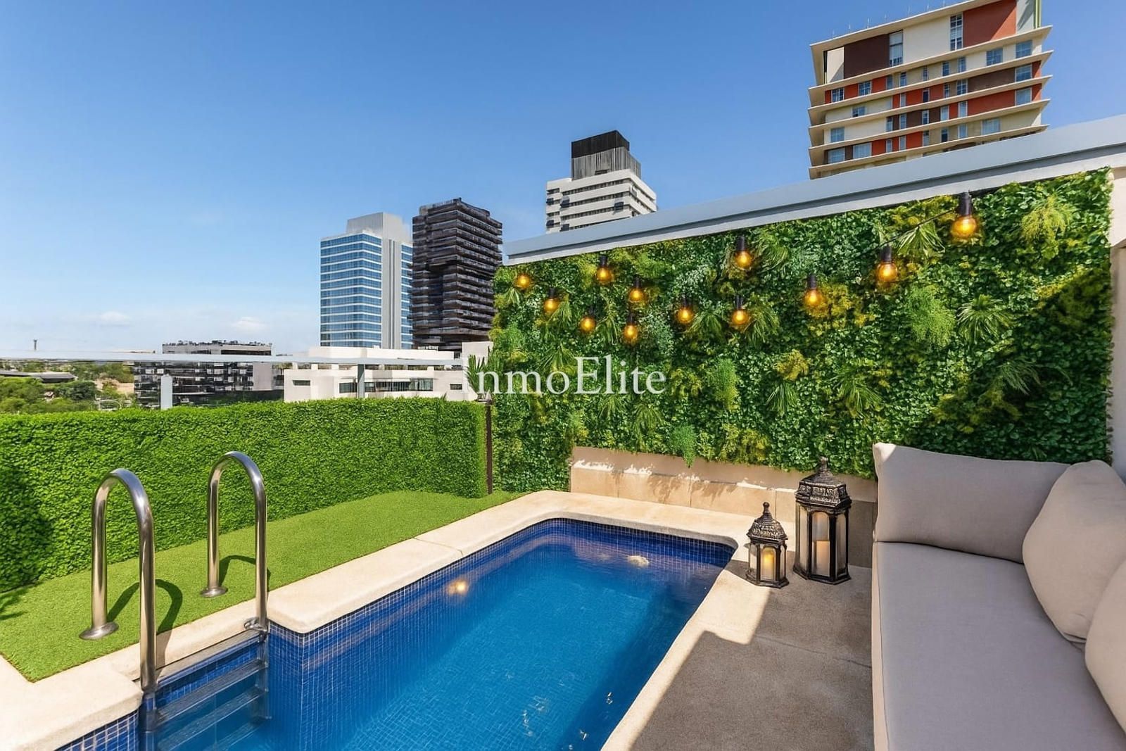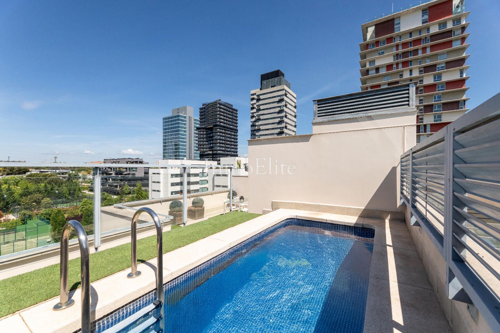 En la planta superior encontramos un amplio hall que puede ser aprovechado para una estancia adicional dando acceso a una increíble terraza solarium a dos alturas con piscina privada. Una terraza que destaca por su privacidad y vistas panorámicas a las Cuatro Torres de Madrid.