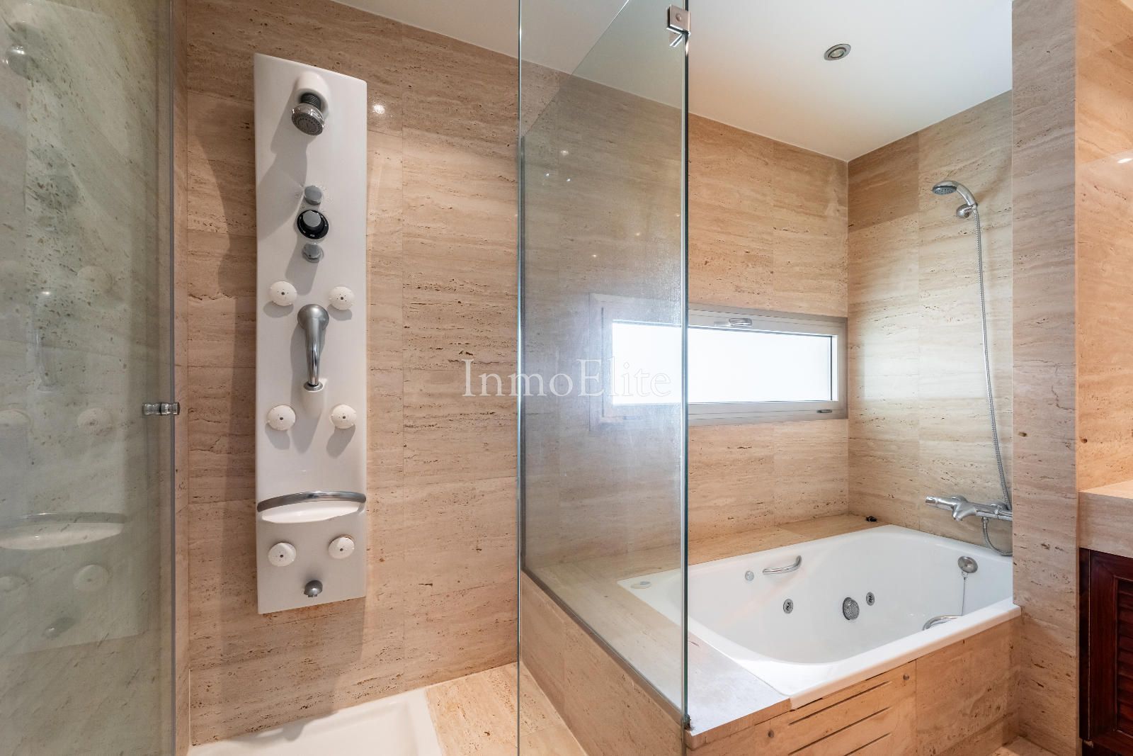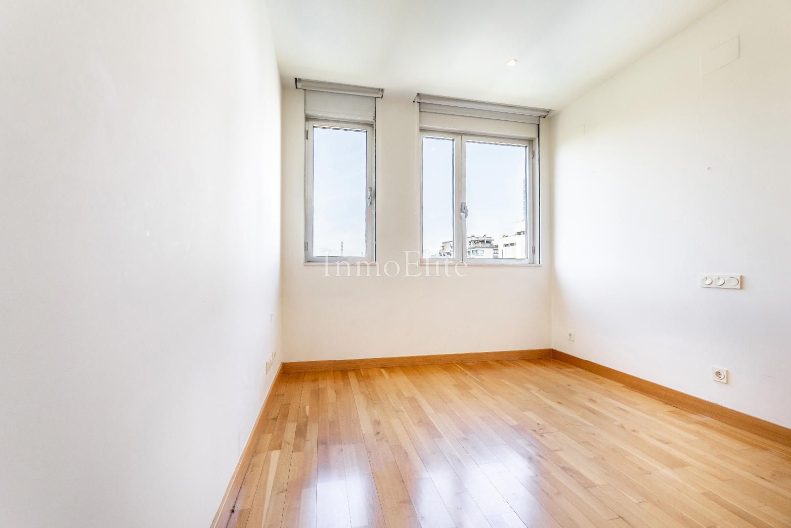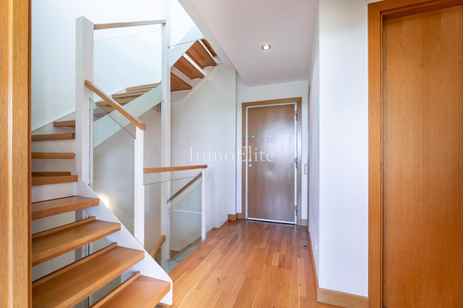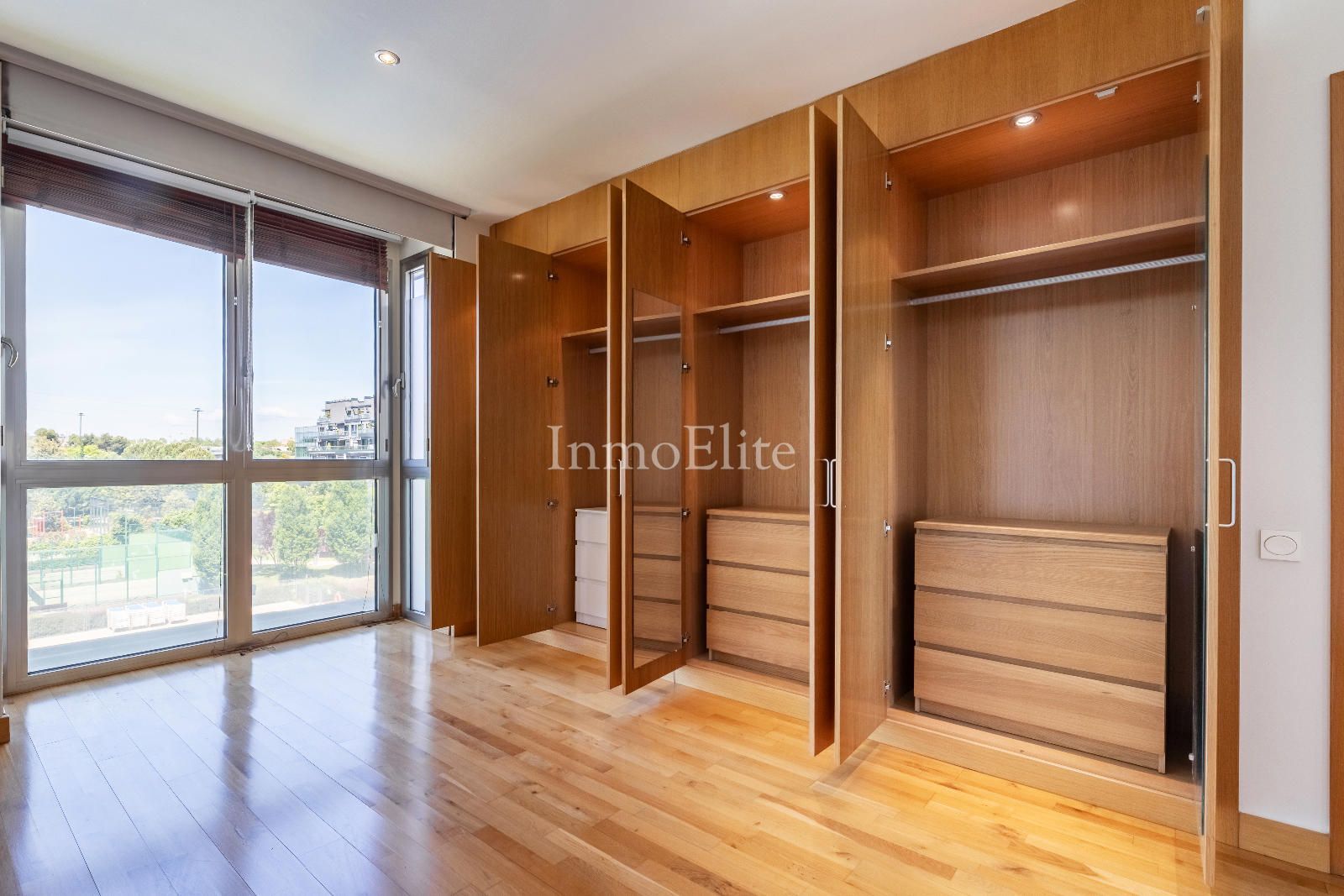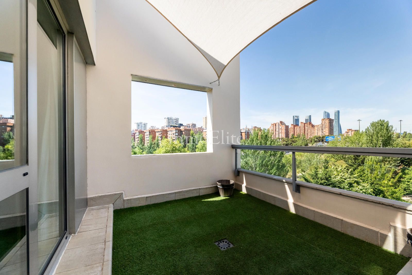 En la planta superior encontramos un amplio hall que puede ser aprovechado para una estancia adicional dando acceso a una increíble terraza solarium a dos alturas con piscina privada. Una terraza que destaca por su privacidad y vistas panorámicas a las Cuatro Torres de Madrid.